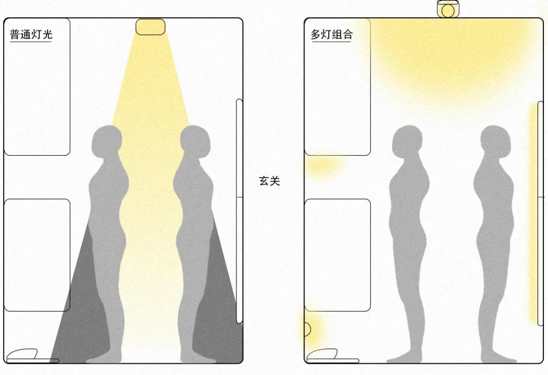說到玄關(guān)的照明設(shè)計(jì),一般而言,首先會在頂部,用線性燈槽或者筒燈,作為整體空間的基礎(chǔ)照明。但人的活動或儲物柜,會遮擋部分光線,造成暗區(qū)、照度不均,影響視線。因此,換鞋區(qū)上方、玄關(guān)柜臺區(qū)可分別采用射燈、柜下感應(yīng)燈或燈帶,進(jìn)行局部補(bǔ)充照明。
